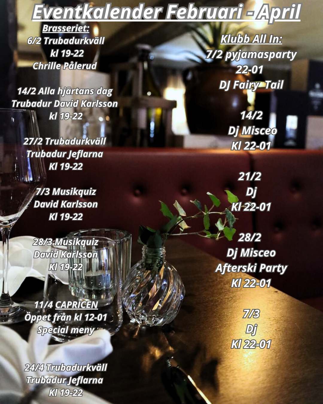 Varje lördag från kl 22.00-01.00 håller våran nattklubb öppet. Vi dunkar på med grym musik & härliga DJ:s på klubb All In.