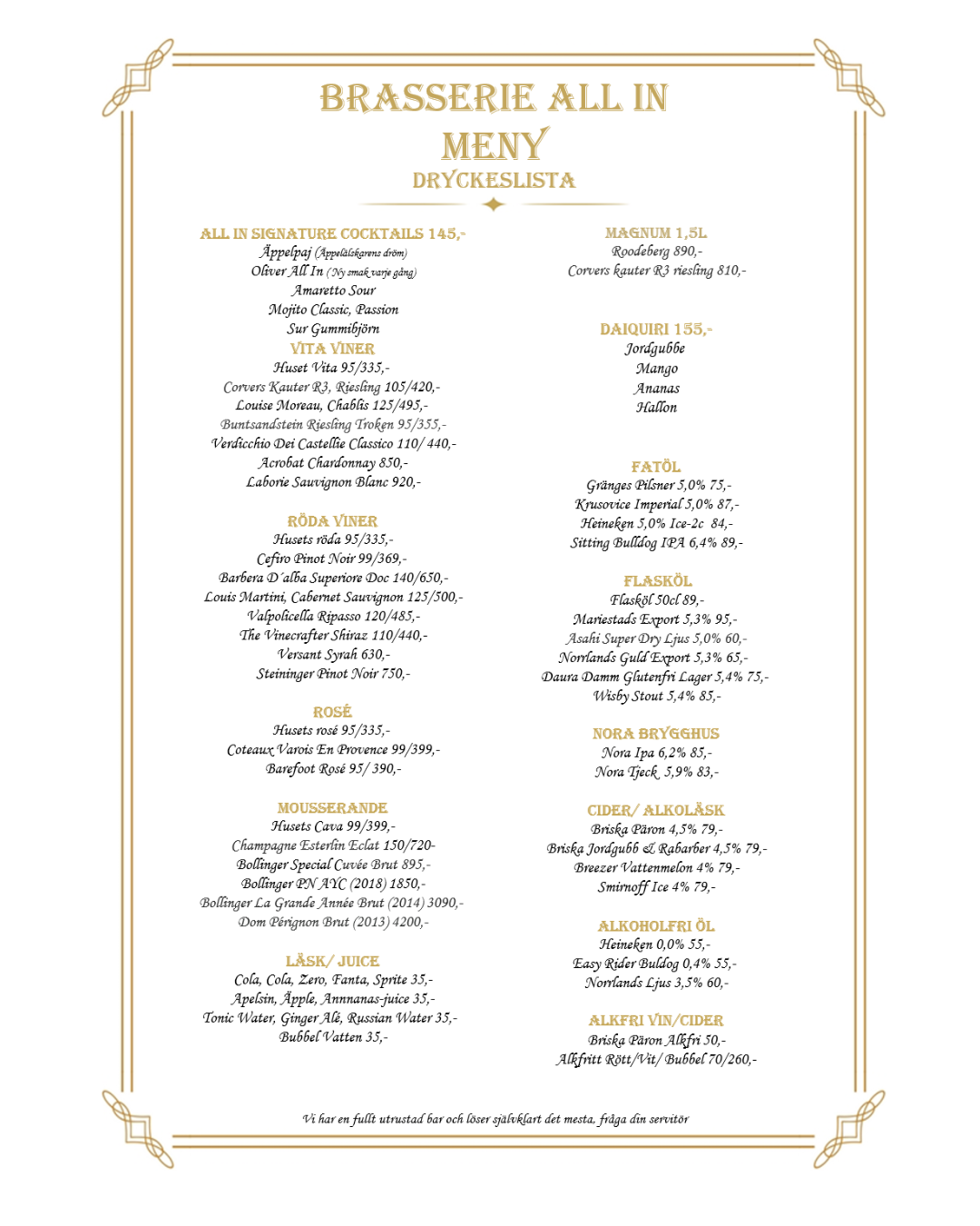 Brasserie All In ska stå för genuint lagad mat med god service & grymma drinkar med små hintar från Stockholms takterrasser till rötterna från husets grund